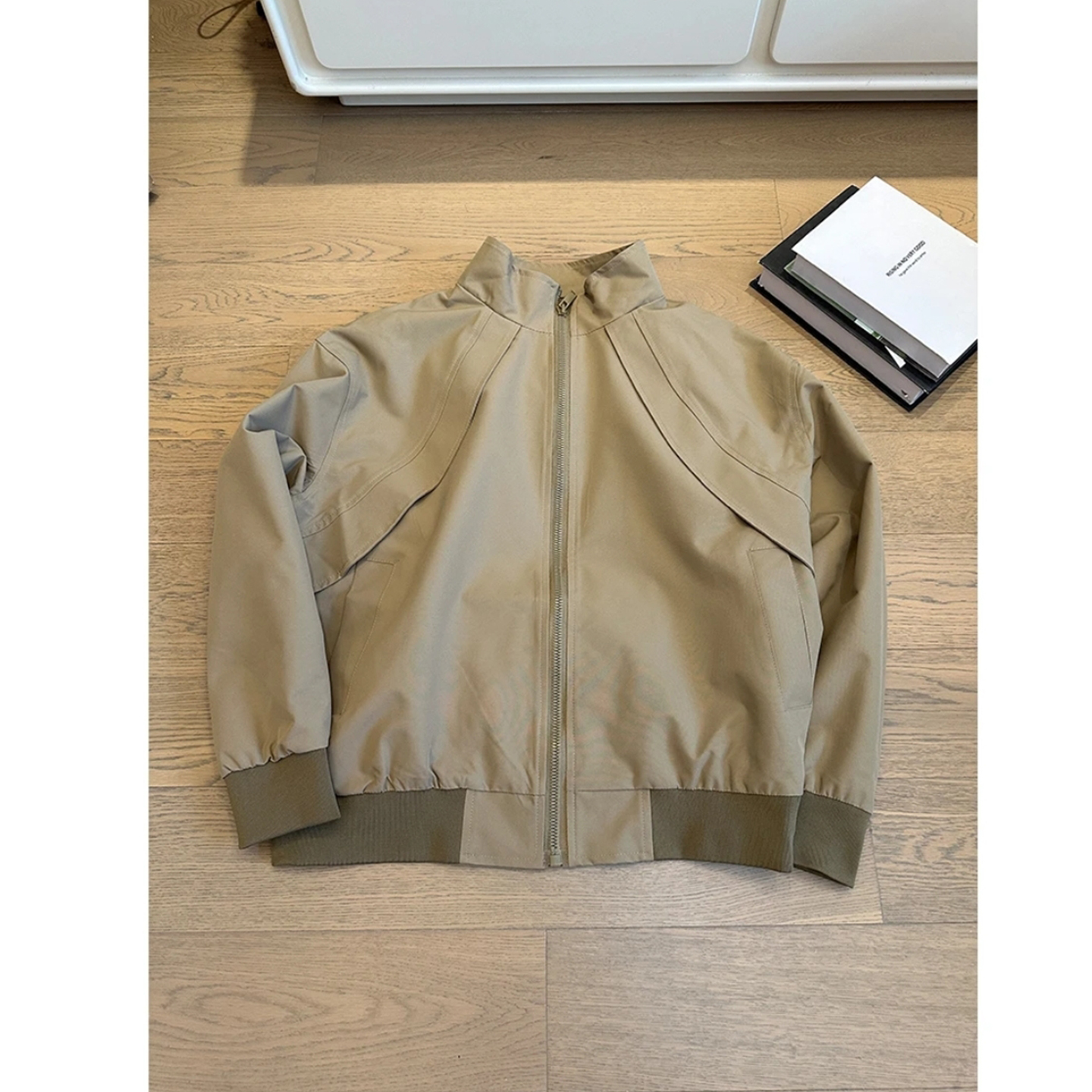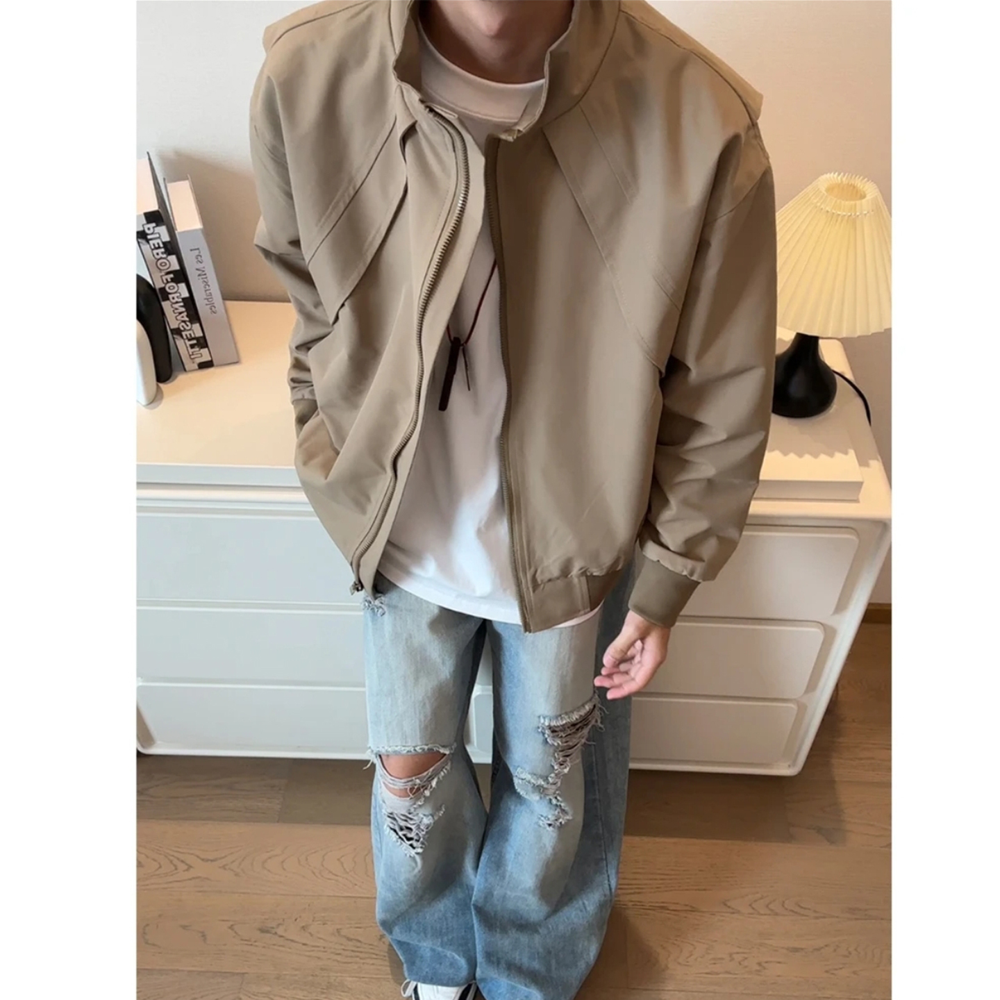 Khaki patchwork deconstructed jacket men's autumn boxy short box stand-up collar jacket ruffian silhouette outdoor baseball suit